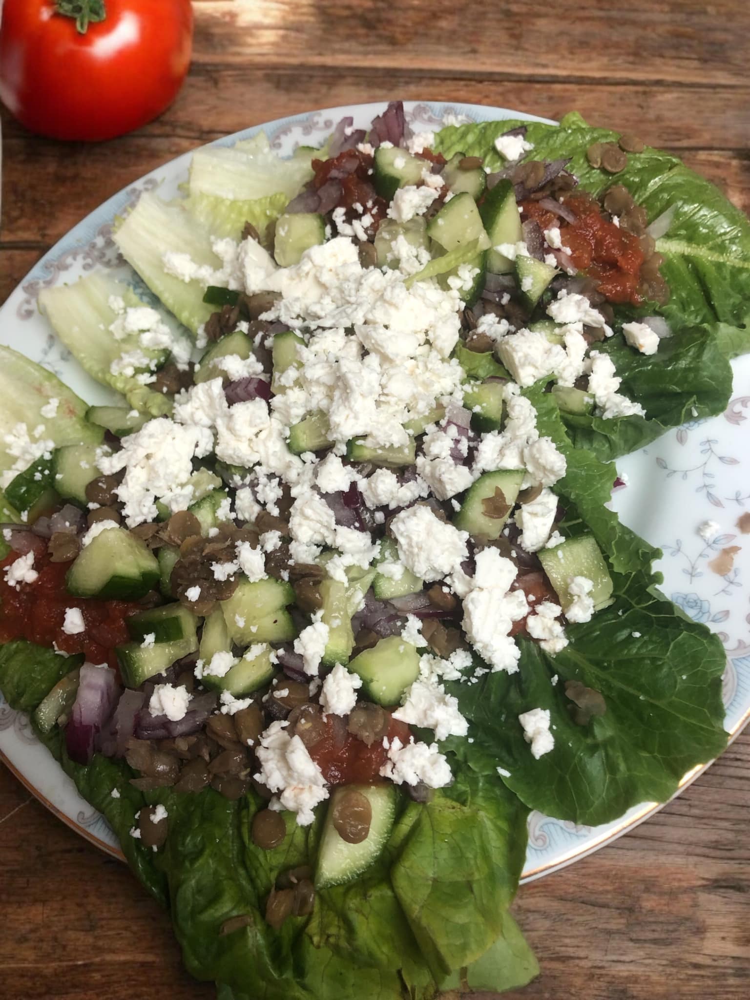 | 4. Evenly distribute the diced cucumber, red onion, and boiled black lentils among the lettuce leaves. |