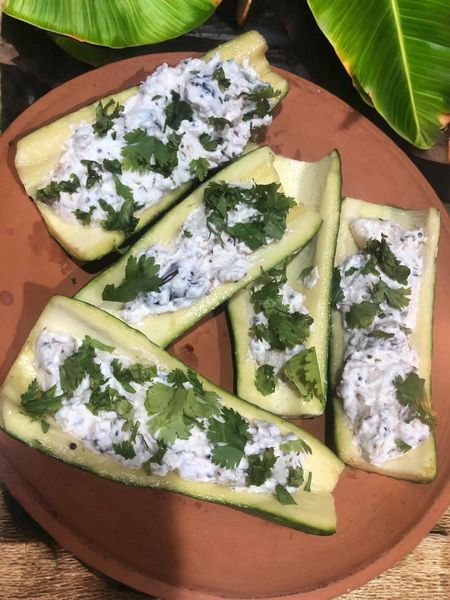 Huma’s Stuffed Zucchini Boats with homemade Coconut Pachadi ✨💕👩🍳 A perfect indo-western healthy low carb dinner recipe innovation which is a blend of South Indian Coconut Pachadi (Telugu delicacy) mixed in Hung Curd and served with Pan Roasted Zucchini (turai) for that western touch for western kids … lol 😋✨